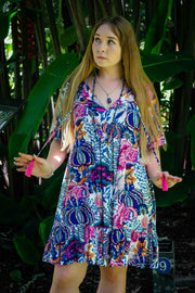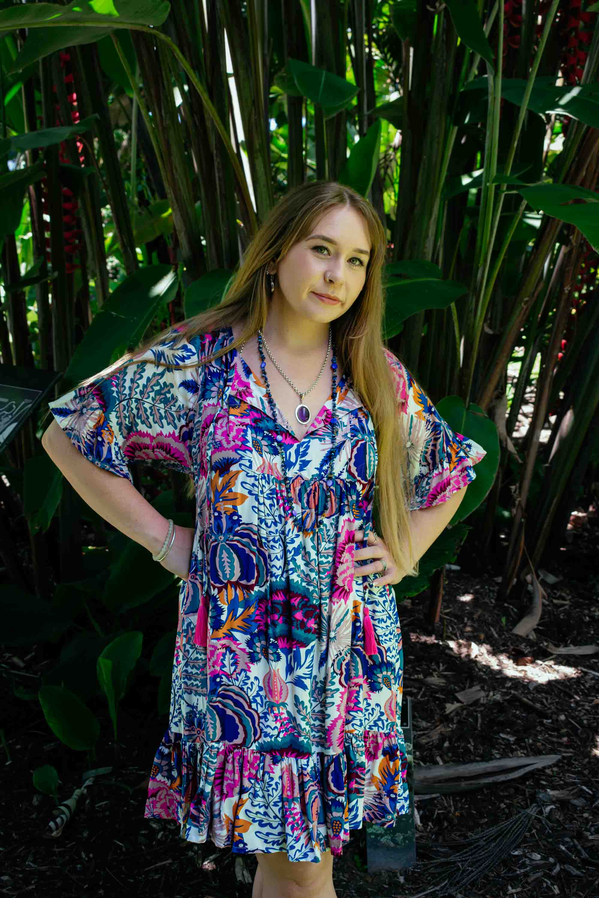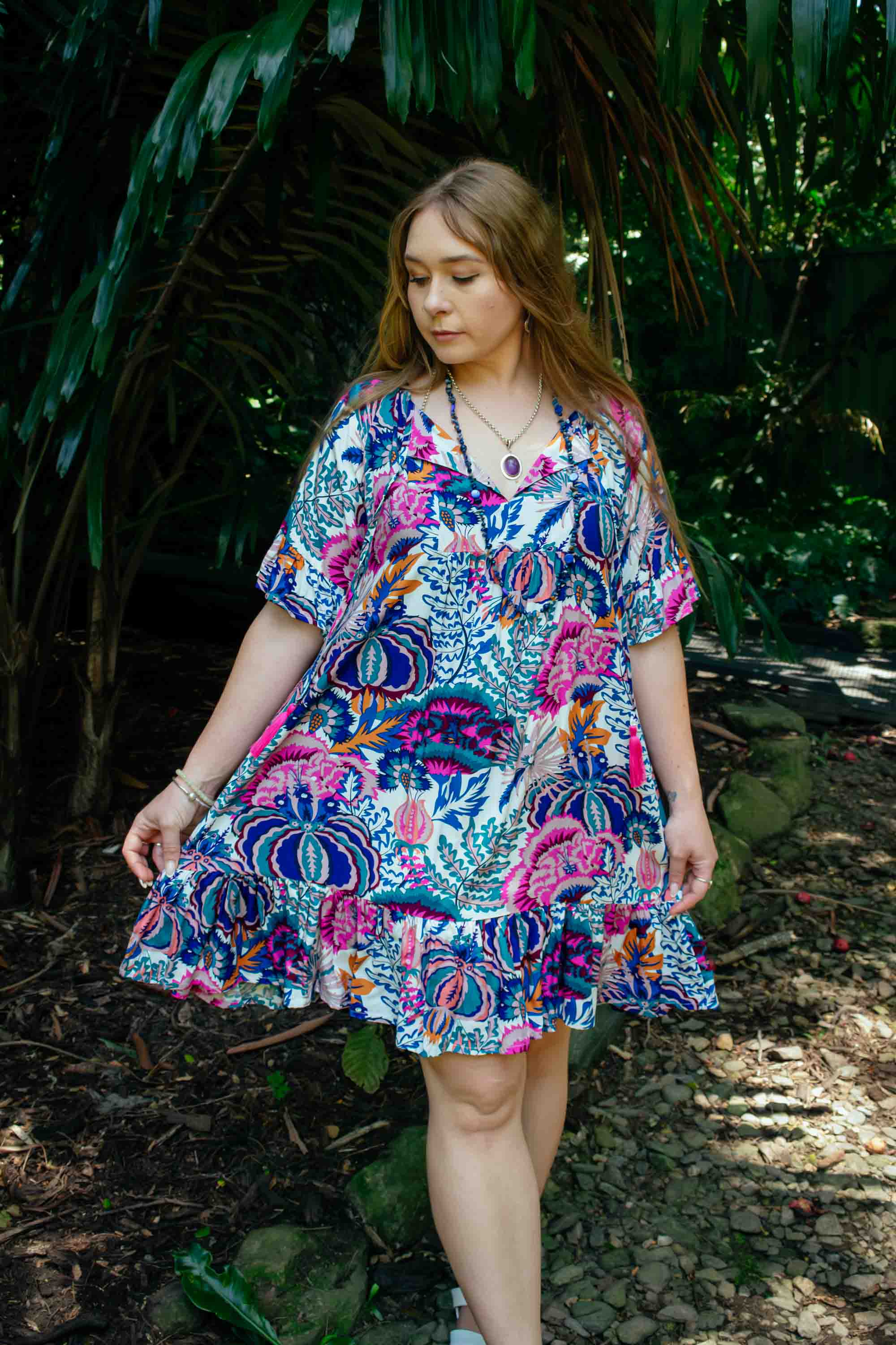 Soft, romantic, and beautifully balanced, our Cosmo Short Dress – Cream Flora is a gentle celebration of feminine colour and delicate detail. Featuring warm, muted tones of Cream, Pink, Purple, Orange, and Blue, this fine floral print feels reminiscent of an antique tapestry, offering a look that is striking yet understated. Crafted from cool, silky-feel Rayon, the relaxed silhouette drapes effortlessly, while the adjustable neckline allows you to choose between a flattering V or a more modest rounded finish. Finished with fluted elbow-length sleeves, it’s a timeless piece for elegant everyday wear.