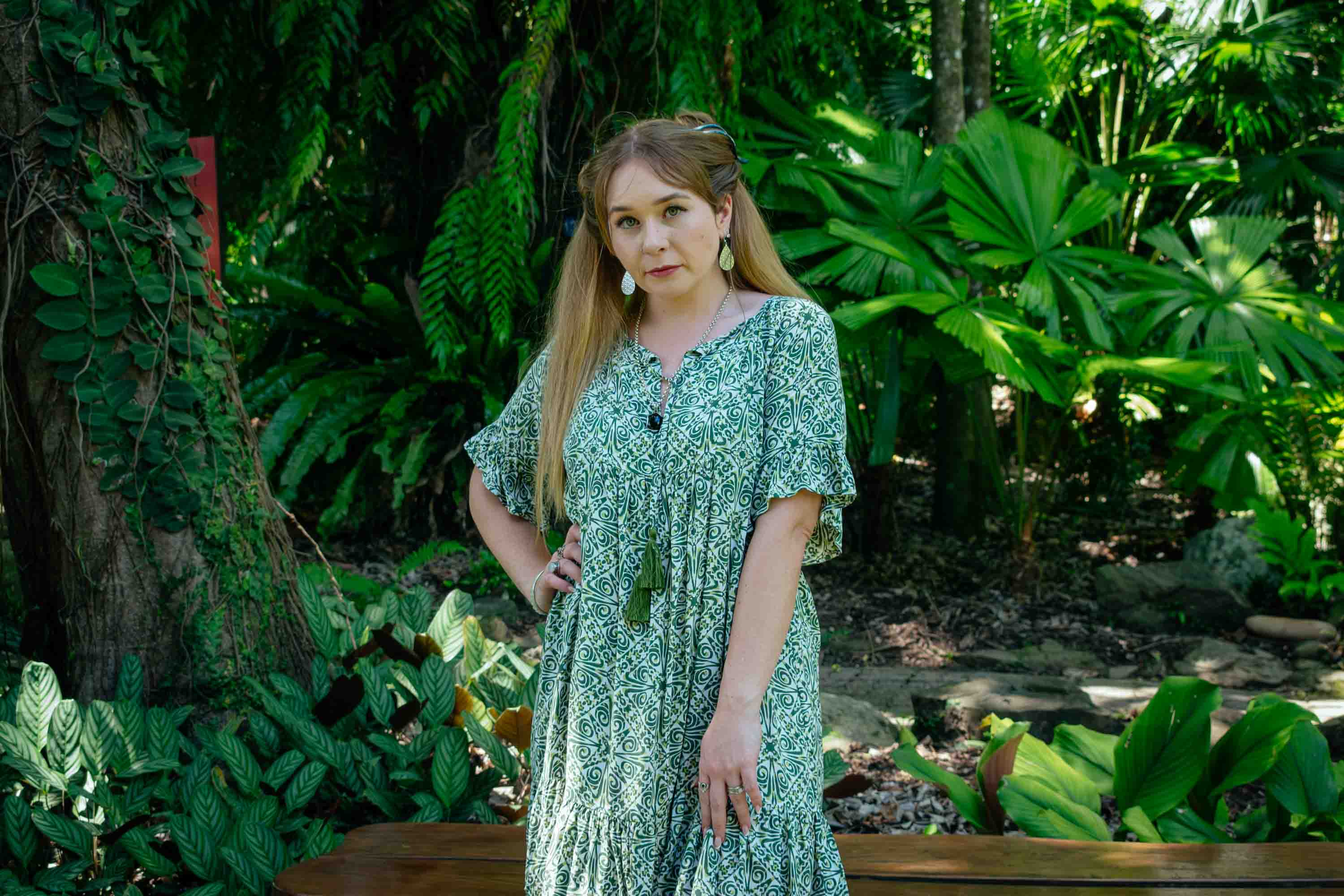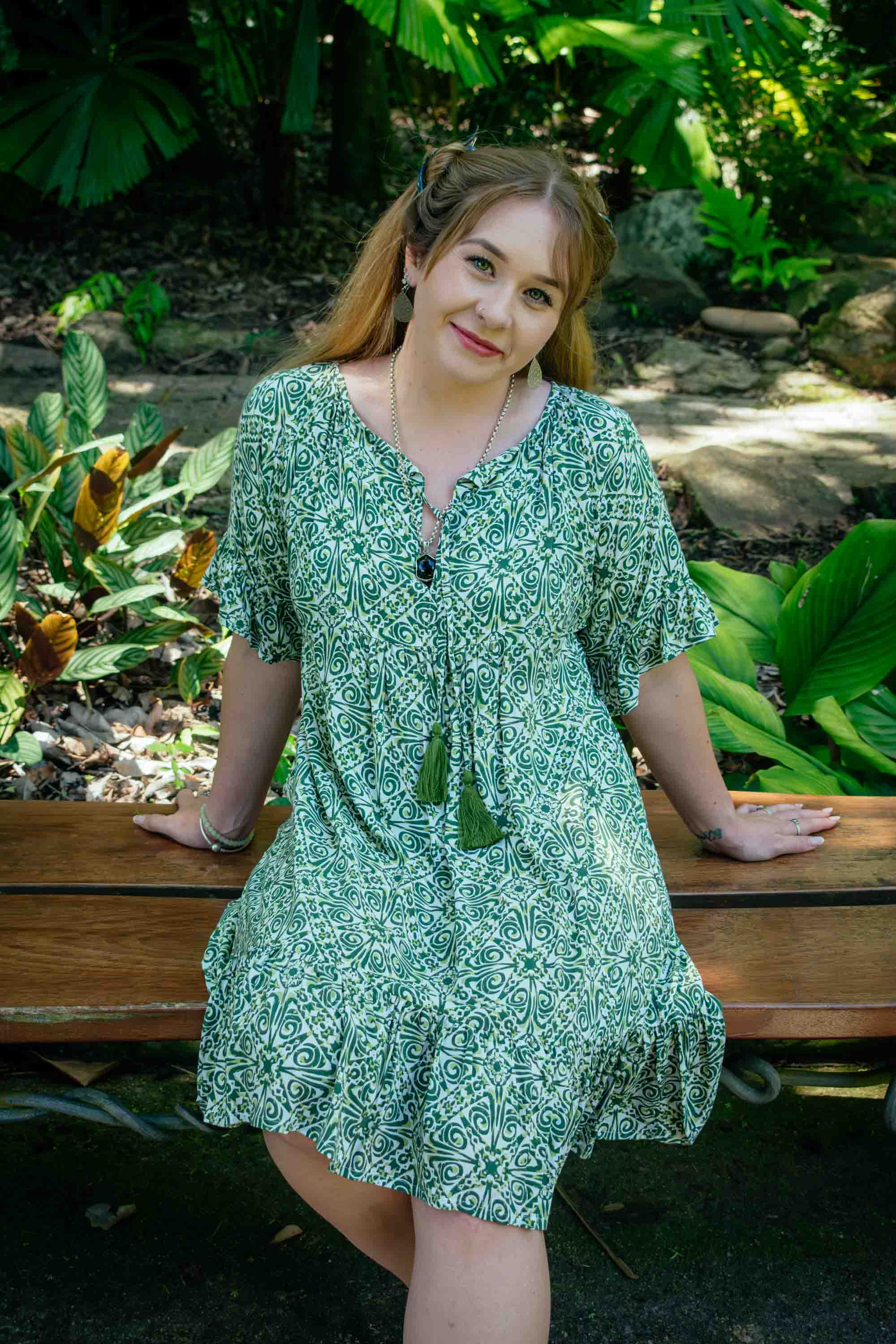 Elegant, calming, and quietly captivating, our Cosmo Short Dress – Green Star features a repeating star motif inspired by ancient mosaic patterns. Set against a crisp White base, the restrained palette of Hunter and Olive Green creates a look that feels light, balanced, and beautifully refined. Crafted from cool, silky-feel Rayon, this relaxed silhouette drapes softly on the body and includes an adjustable neckline that can be styled as a flattering V or drawn higher for a more modest finish. Finished with fluted elbow-length sleeves, it’s an effortless piece for understated summer elegance.