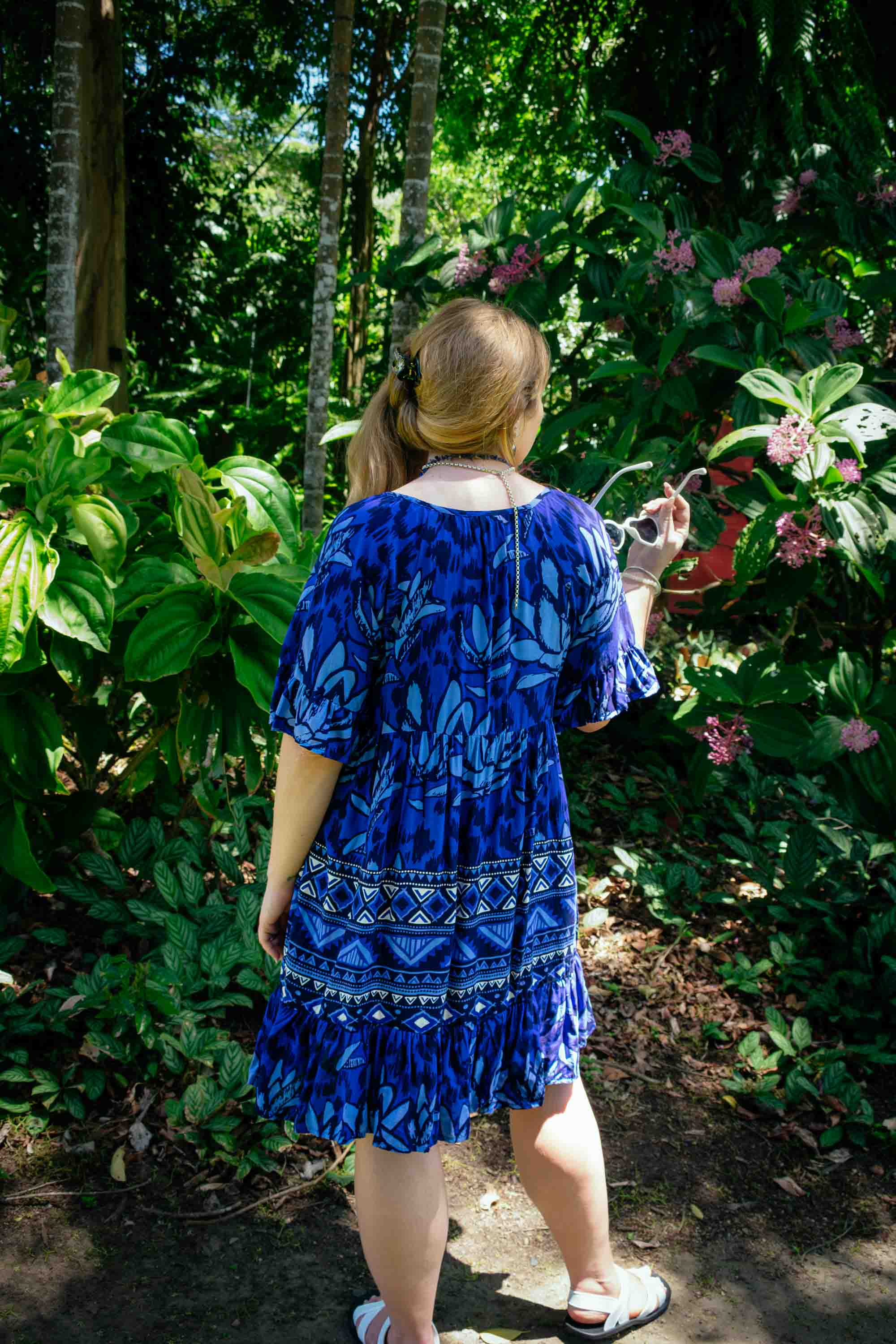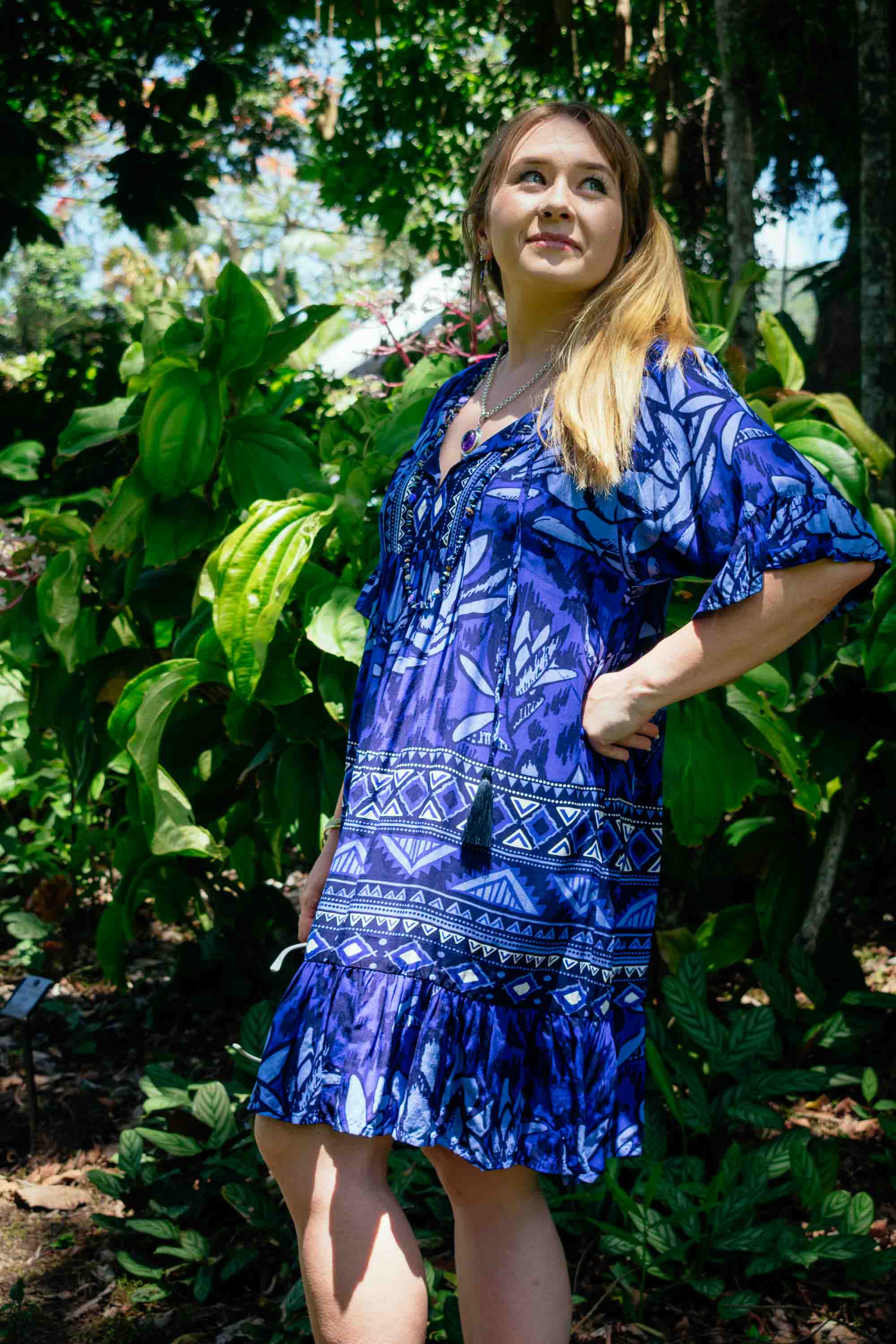 Bold, eye-catching, and effortlessly stylish, our Cosmo Short Dress – Navy Seas brings together rich Cobalt, soft Light Blue, deep Navy, and crisp White in a striking fusion of abstract and geometric patterning. Designed to turn heads, this vibrant print adds instant impact to an easy, relaxed silhouette. Crafted from cool, silky-feel Rayon, it drapes beautifully on the body and features an adjustable neckline that can be worn as a flattering V or drawn higher for extra coverage. Finished with fluted elbow-length sleeves, it’s a standout piece for warm days and confident styling.