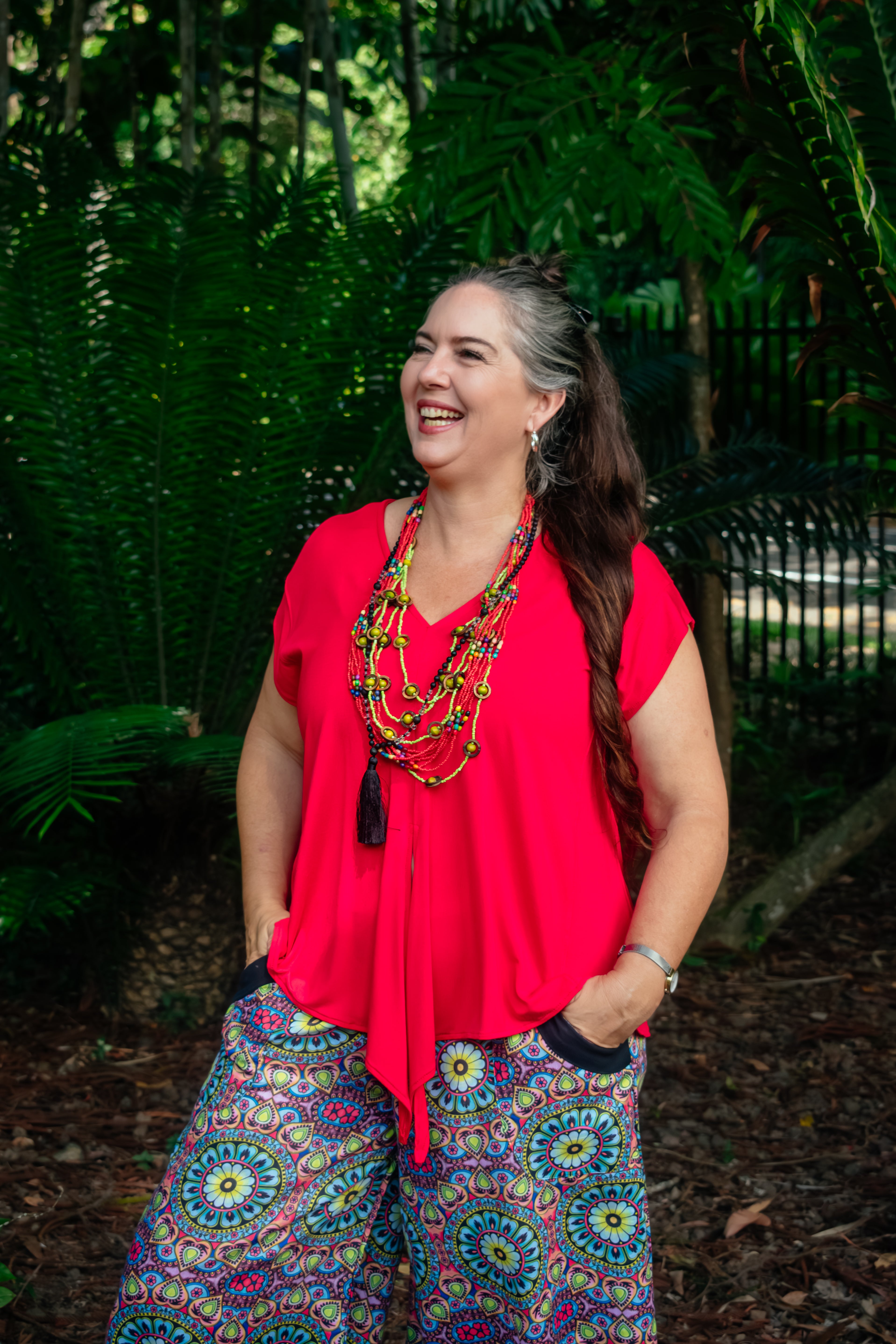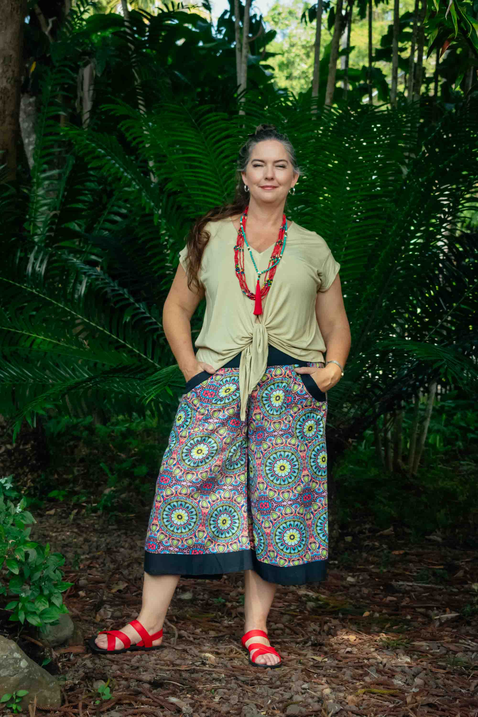 Playful yet refined, our Jilly Pants in Hoopla are designed for those who love colour and comfort in equal measure. Featuring a kaleidoscope of mandala-inspired shapes in peach, teal, lime, yellow, orange, red, and soft pink tones, these pants radiate joyful boho energy. Made from 100% cotton, they’re cool, breathable, and beautifully easy to wear. The wide culotte-style leg offers relaxed movement, while the flattering black yoke waistband and elasticised back create comfort and shape. Contrast black trim on the pockets and leg hem adds the perfect polished finish..