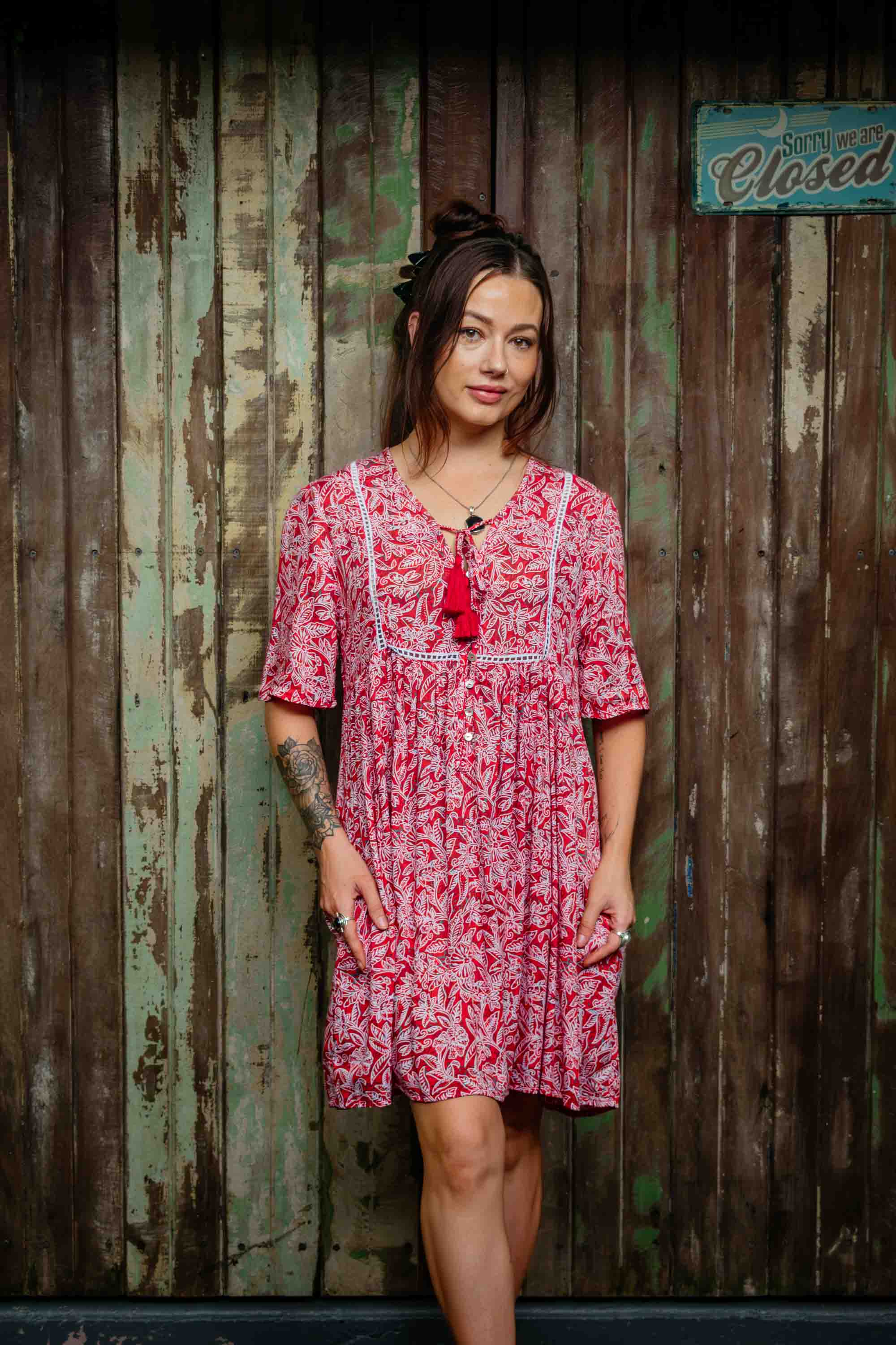 Soft, feminine, and rich in relaxed bohemian charm, our Stellar Short Dress – Batik Terracotta features a warm Terracotta base decorated with a delicate White batik-style floral pattern for an earthy, handcrafted look. Made from high-quality, cool wearing Rayon, it offers breathable comfort for everyday wear. The empire waistline and gently gathered skirt create a flowing, easy silhouette, while the crochet detailing and tassel-tie neckline add artisan appeal. With in-seam pockets, a generous fit, and lightweight feel, this dress is perfect for effortless summer days or holiday adventures.