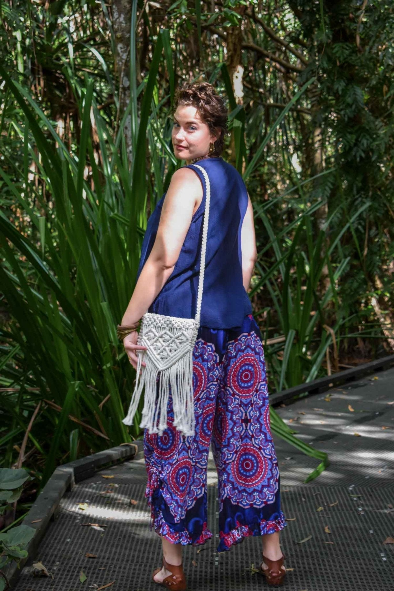 Discover our perennially beloved "Passport" pocket pants, cherished by women of all sizes from size 8 to 16, renowned for their flattering silhouette, supremely cool comfort and an effortlessly Boho/ Hippie Chic look. Available in a new captivating "Passionflower" print in a beautiful blend of Navy and Periwinkle Blue, dark Red and light Rosy Pink, you too will cherish the fun and playful essence of these trousers, tailored for a relaxed fit that ensures both comfort and style.