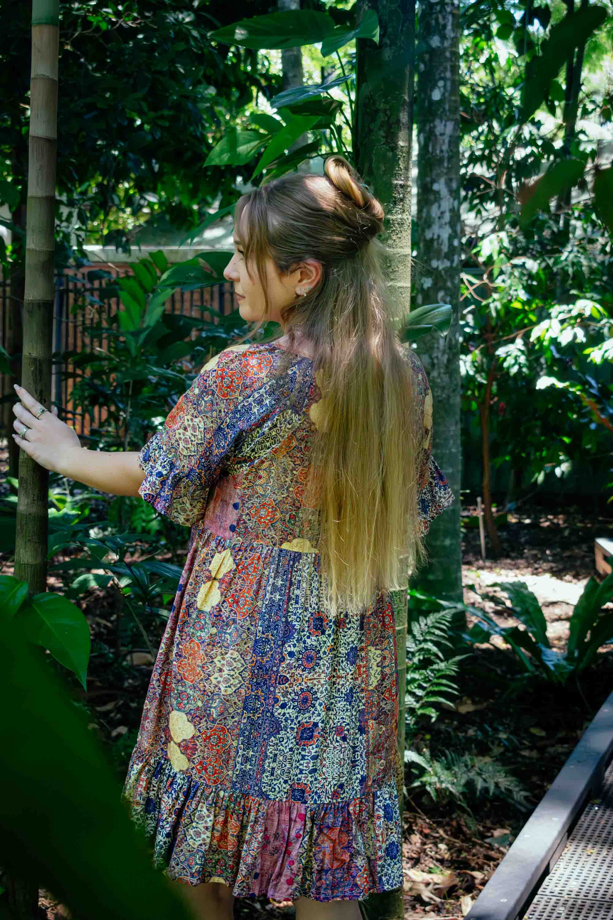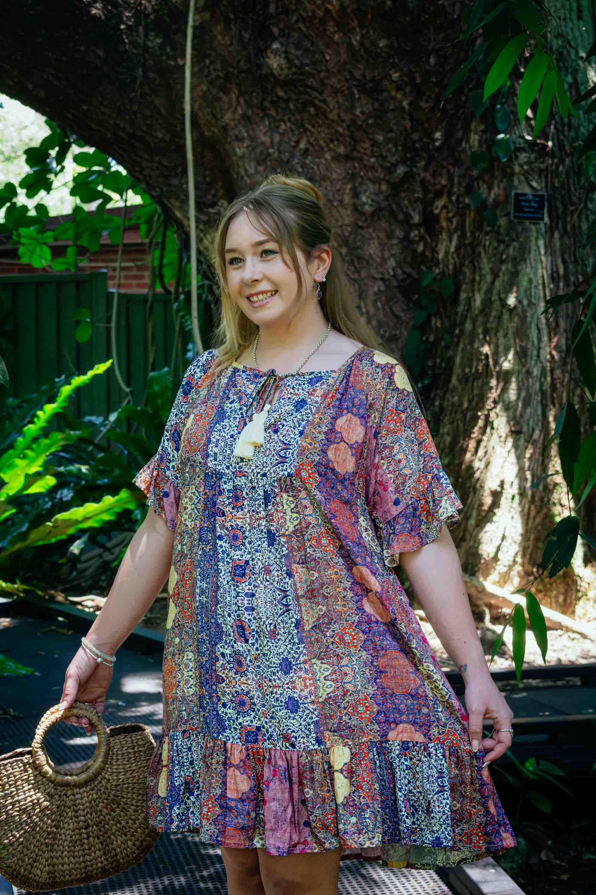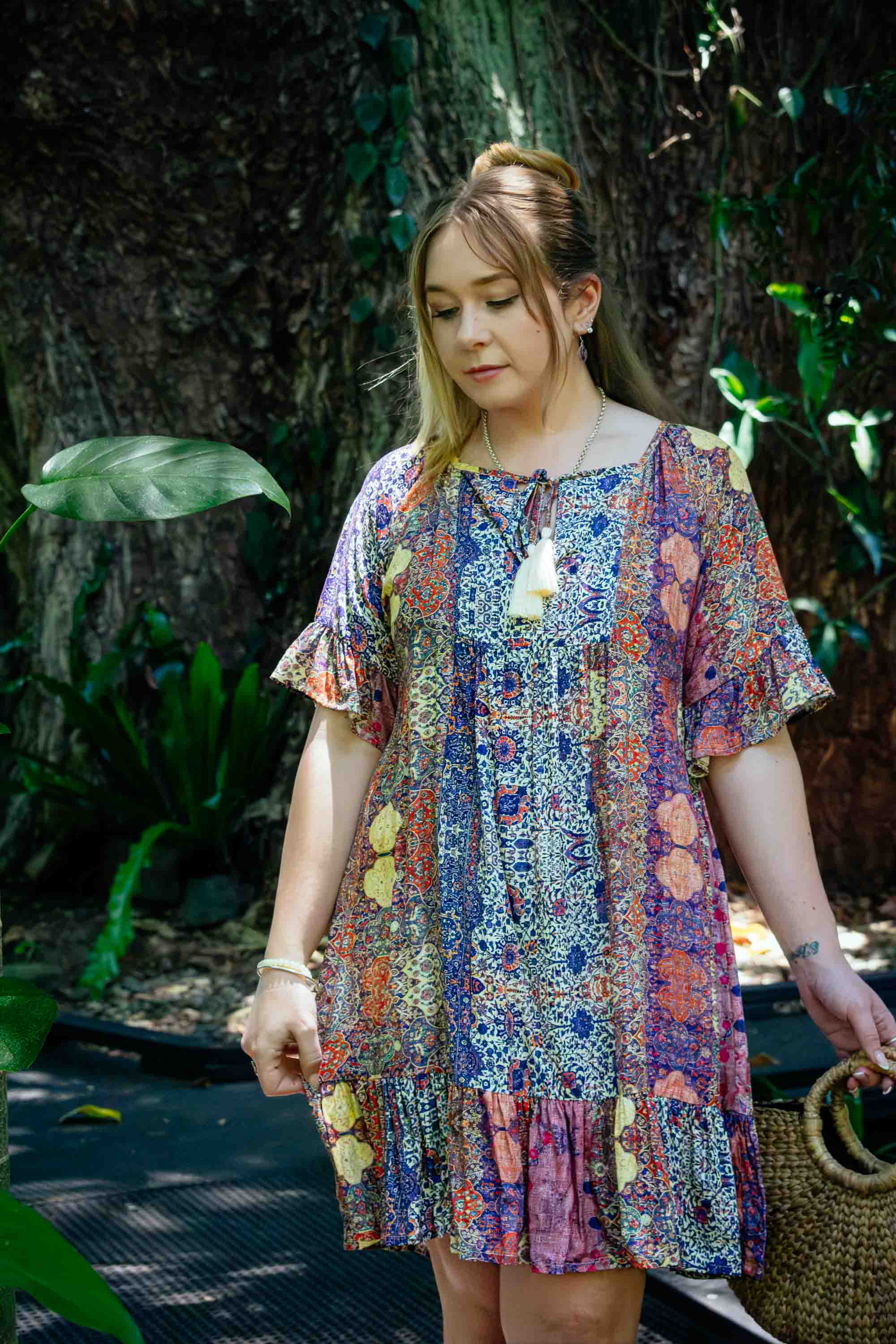Vibrant, artistic, and beautifully expressive, our Cosmo Short Dress – Purple Fractal showcases a kaleidoscope of colour layered over a crisp White base. Rich tones of Teal, Royal Blue, Mustard, Hot Pink, Buff, and Maroon blend effortlessly through a flora- and nature-inspired fractal print, creating a look that feels bold yet harmonious. Crafted from cool, silky-feel Rayon, this relaxed silhouette drapes softly on the body and features an adjustable neckline that can be styled as a flattering V or drawn higher for a more modest finish. Completed with fluted elbow-length sleeves, it’s a true statement piece for confident, joyful dressing.