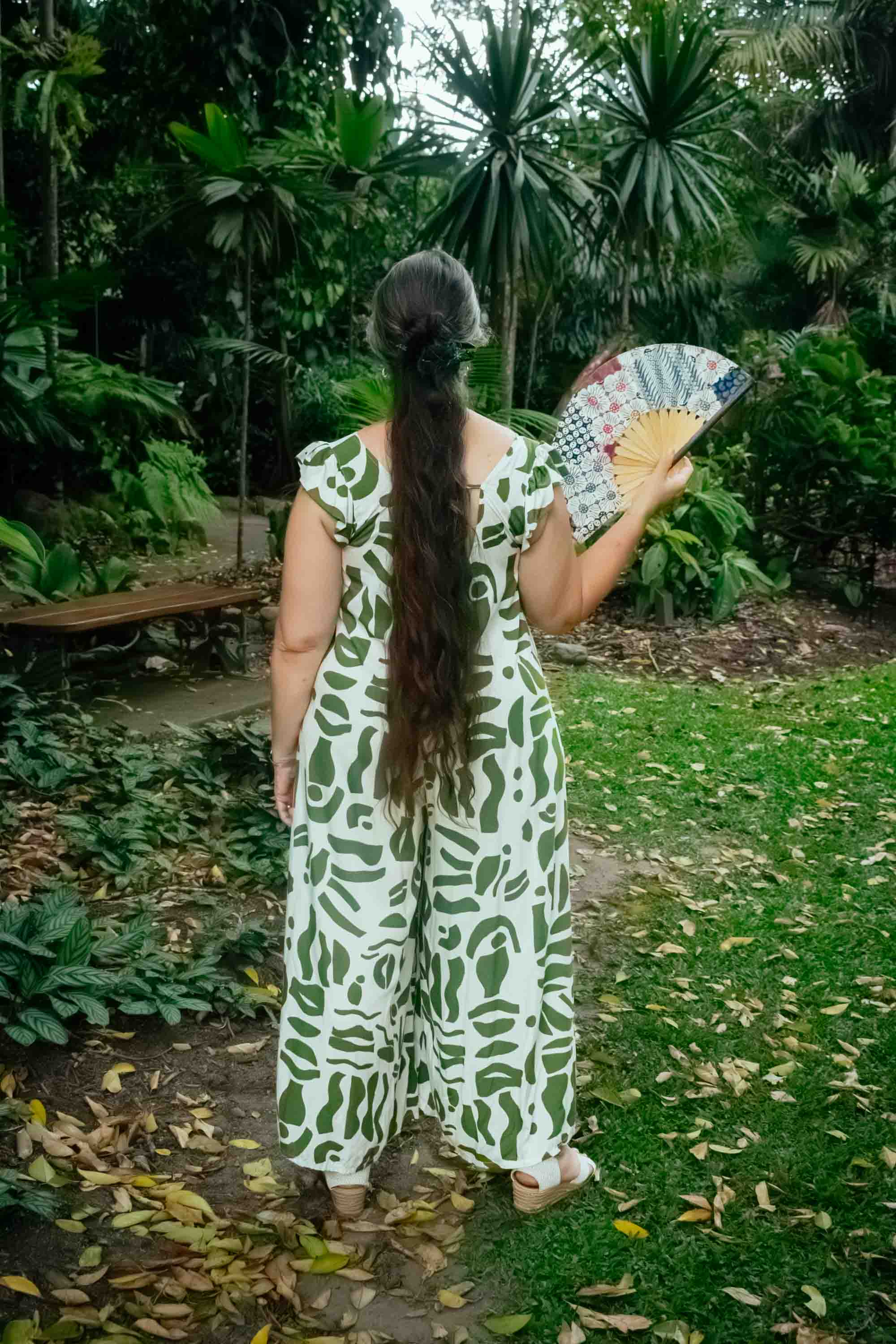 Earthy, elegant, and effortlessly expressive, our Divinity Pantsuit – Zulu Olive blends relaxed comfort with bold boho character. Made from cool, lightweight Rayon, it drapes beautifully in a long, linear silhouette that flatters and elongates the body. The Zulu Olive print features a soft Olive background with a Cream abstract pattern, creating a warm, natural contrast perfect for day or evening styling. Finished with flutter sleeves, a V-neckline, and back tie detailing, this free-size design adapts gracefully to both casual and dressy occasions. A versatile one-piece that lets your effortless boho confidence shine.