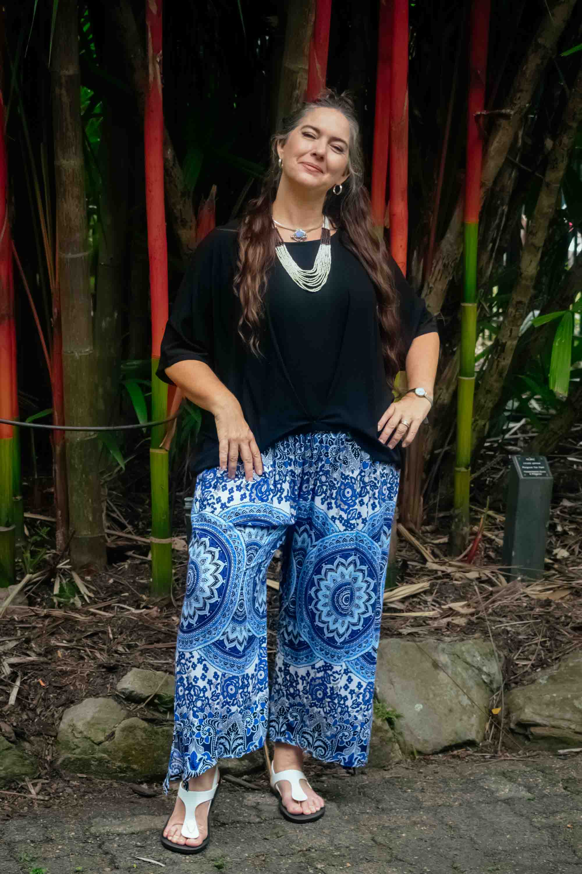 Stylish, soft, and effortlessly comfortable, our Freya Pants in Fruity Dark Blue are a staple piece for relaxed boho living. Featuring a bold mandala-inspired design in deep blue tones accented by floral and leaf patterns, this fresh print captures an earthy yet vibrant mood. Crafted from lightweight, breathable rayon, the wide-leg cut flows beautifully while the elasticized shirred waistband ensures comfort. With adjustable ankle ties and a generous fit, these pants move easily from casual days to resort escapes with laid-back confidence.