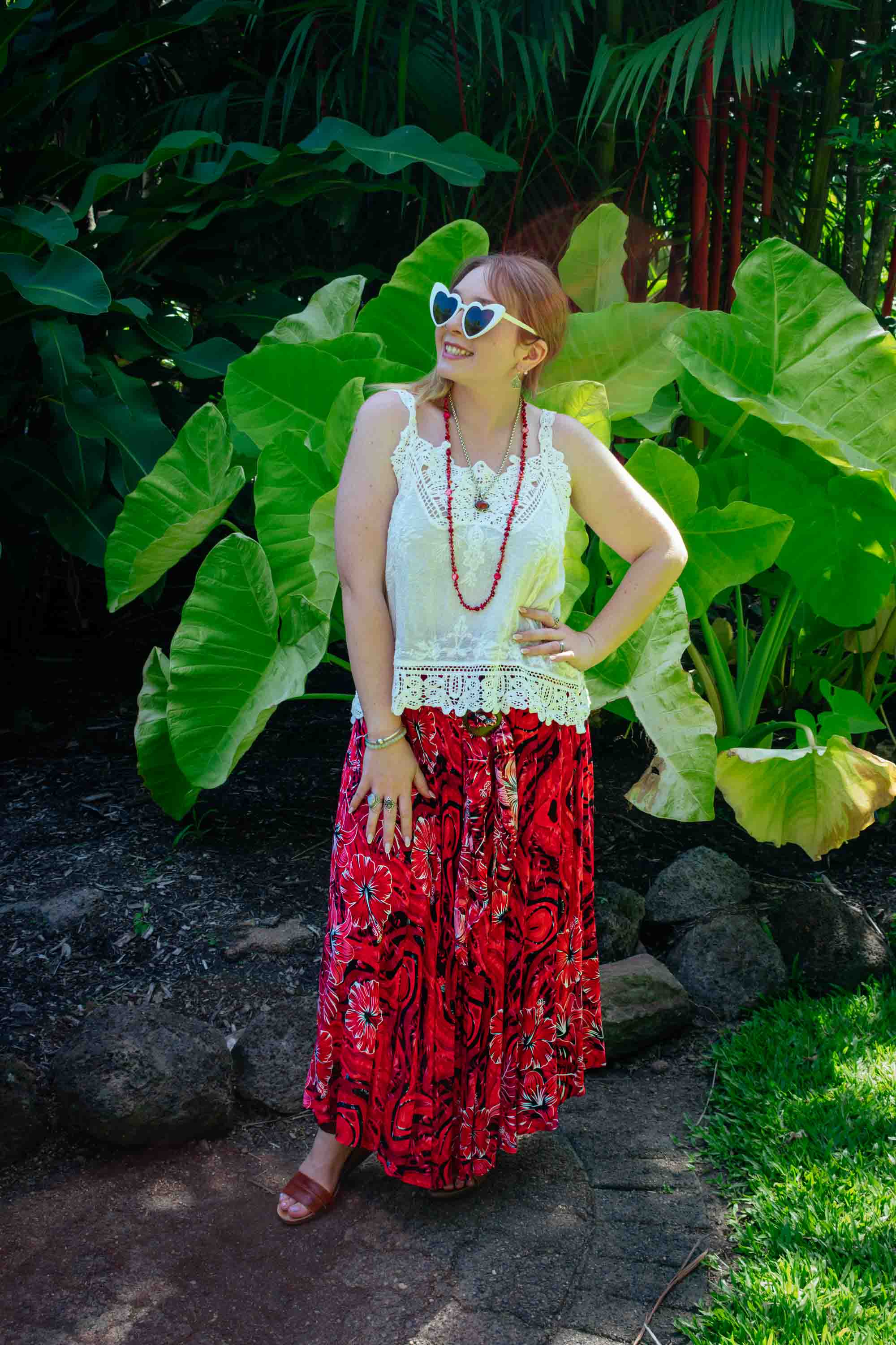 Bold, passionate, and beautifully free-spirited, our Gypsy Skirt – Dancing Hibiscus Red is designed to make a confident statement while flowing effortlessly with the body. Rich Red tones swirl through an abstract print, highlighted with delicate hibiscus flower details that add depth and a sense of movement. The full-length, softly flared silhouette features a wide hem that drapes gracefully with every step. Crafted from cool, lightweight Rayon, this skirt includes a comfortable under slip and an elasticised shirred waist with adjustable ties finished with a coconut clip for added texture and interest. A striking boho piece that pairs beautifully with simple neutrals or feminine statement tops.
