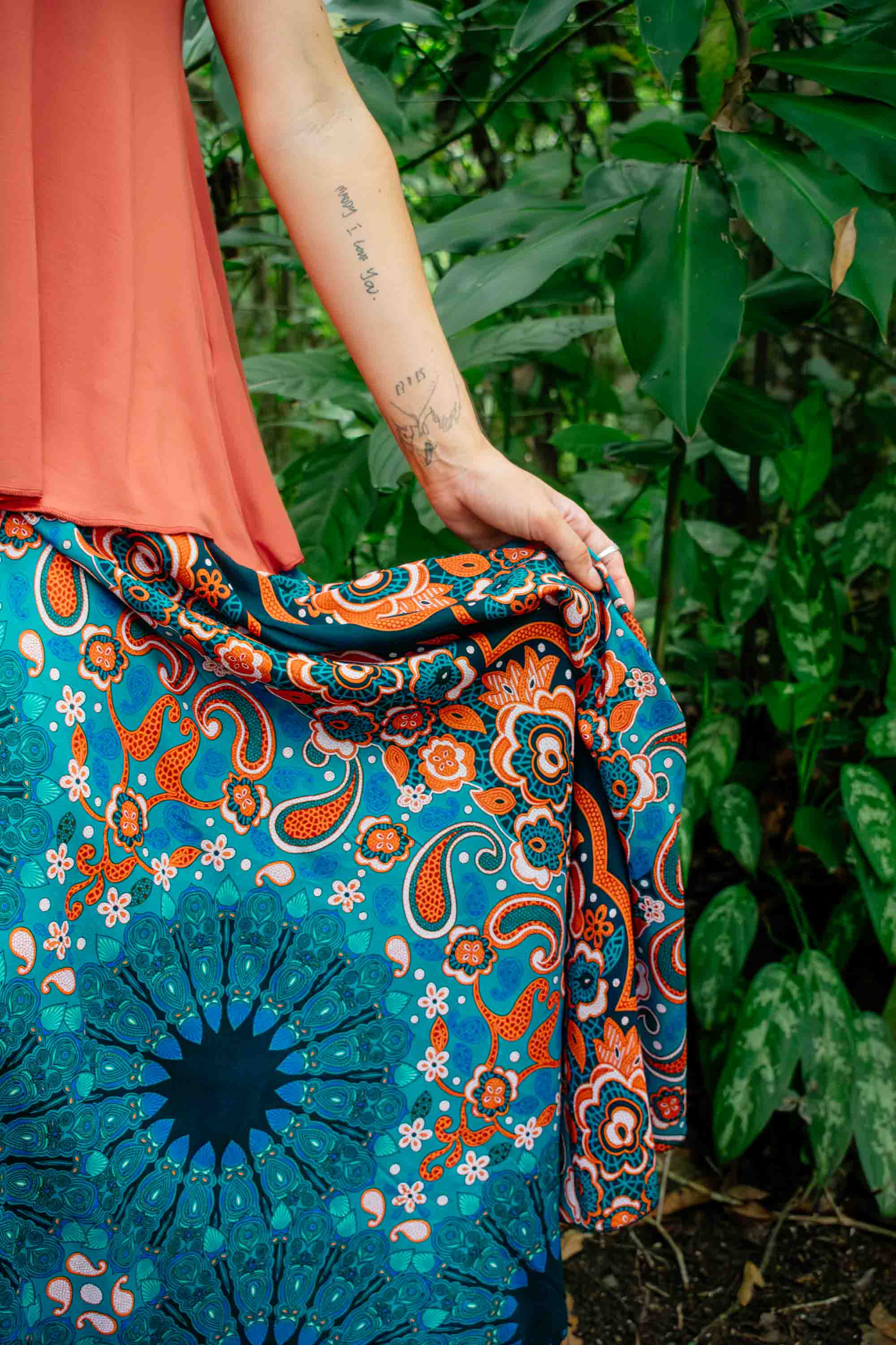 Earthy, flowing, and beautifully expressive, our Karmic Maxi Skirt – Dancer Green blends rich colour with soft, effortless movement. Crafted from cool, lightweight Rayon, this full and voluminous skirt swirls gracefully with every step. The Dancer Green print features a Teal Green base scattered with layered Green tones, overlaid with striking Brown paisley and mandala burst motifs for a warm, grounded boho look. With its flexible elasticised shirred waistband, it can be worn as a dramatic maxi skirt or styled as a strapless dress — perfect for women who love colour, comfort, and versatile summer style.