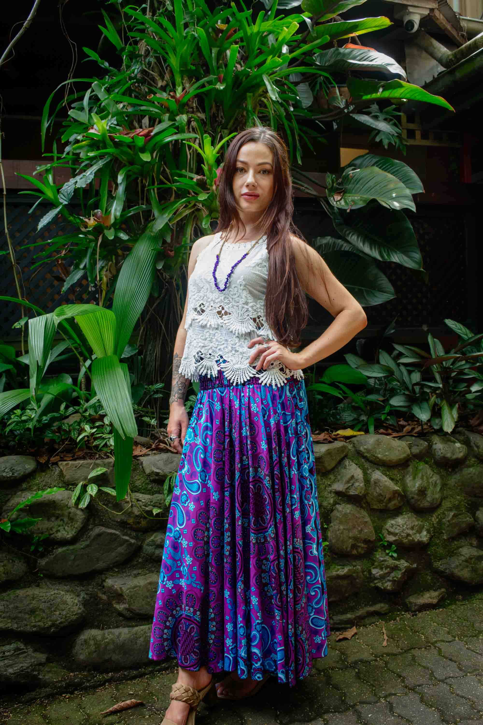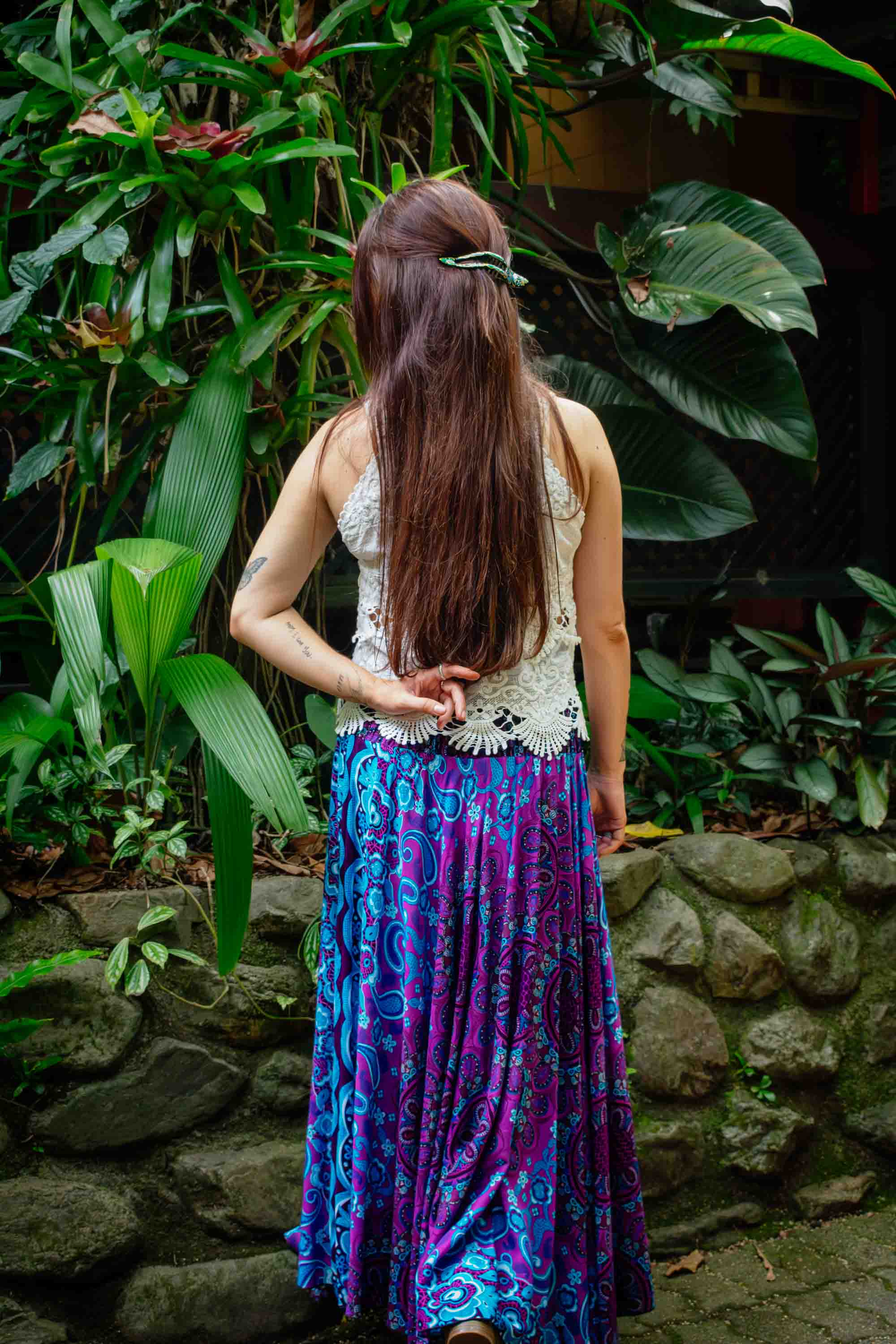 Dreamy, flowing, and beautifully expressive, our Karmic Maxi Skirt – Dancer Purple blends soft movement with a richly coloured boho aesthetic. Crafted from cool, lightweight Rayon, this voluminous full skirt moves gracefully with every step. The Dancer print features a Purple base layered with intricate mandala and paisley motifs in shifting Blue and Purple shades, creating a mesmerising, artistic finish. With its flexible elasticised shirred waistband, this piece can be worn as a classic maxi skirt or styled as a strapless dress - perfect for women who love versatility, colour, and effortless elegance.