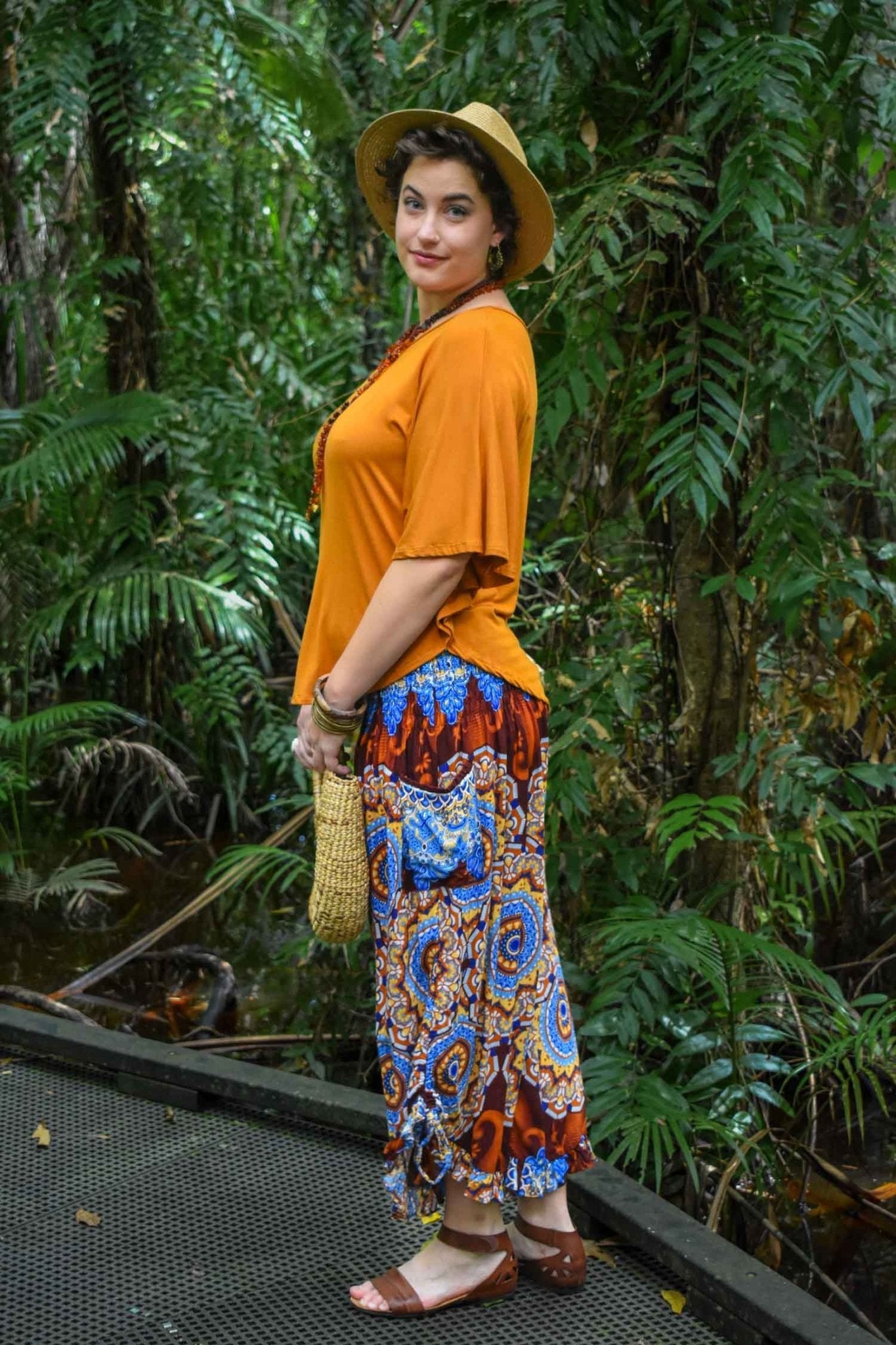 If you're passionate about comfort, our newly arrived "Passport Pants” are the perfect choice for many shapes, ages and styles. Change the look by pulling in the leg ties high and pairing with cute boots or loosen off the leg ties and wear with summer sandals. Matched beautifully here with our new "Avalon - Ochre” Batwing style top for a relaxed but elegant ensemble. Also available in a classic plain Black or White option, they are shown here in a warm and stunning boho blend of Sky Blue and Cobalt against rich tones of Mahogany Brown and light Sandy hues.