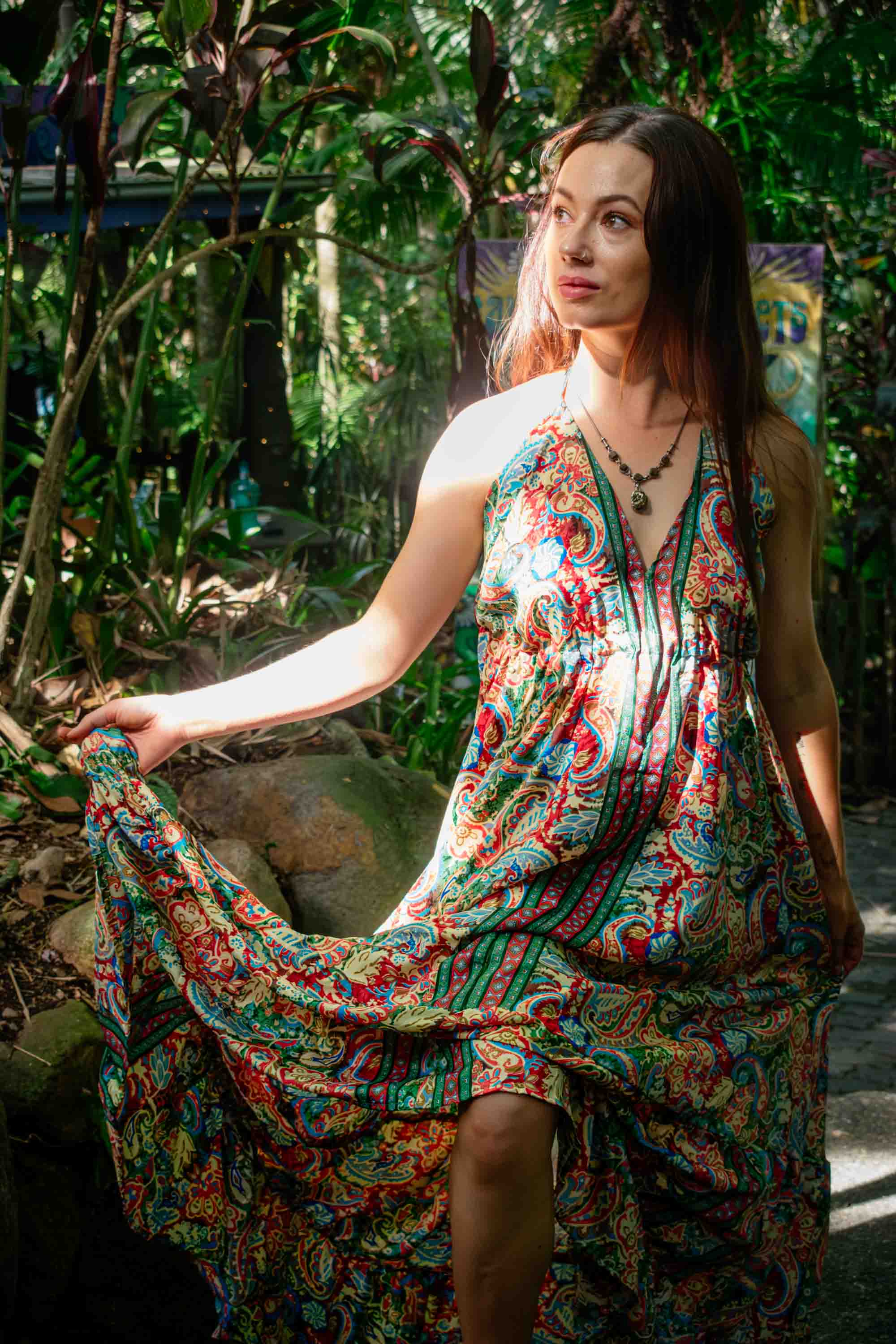 Bold, flowing, and beautifully bohemian, our Shilo Maxi Dress is a goddess-style gown crafted for effortless drama. The soft Yellow–cream base is brought to life with an intricate paisley print featuring expressive shades of Red, Green, and Blue, creating a striking yet feminine colour harmony. Made from cool, silky Viscose, it drapes elegantly with a tiered full-length skirt that moves with ease. The adjustable halter neckline and tie waist allow for a flexible, flattering shape, while the backless design adds an alluring finish. Perfect for warm evenings, summer events, and holidays, this dress is a standout piece for every free-spirited boho beauty.